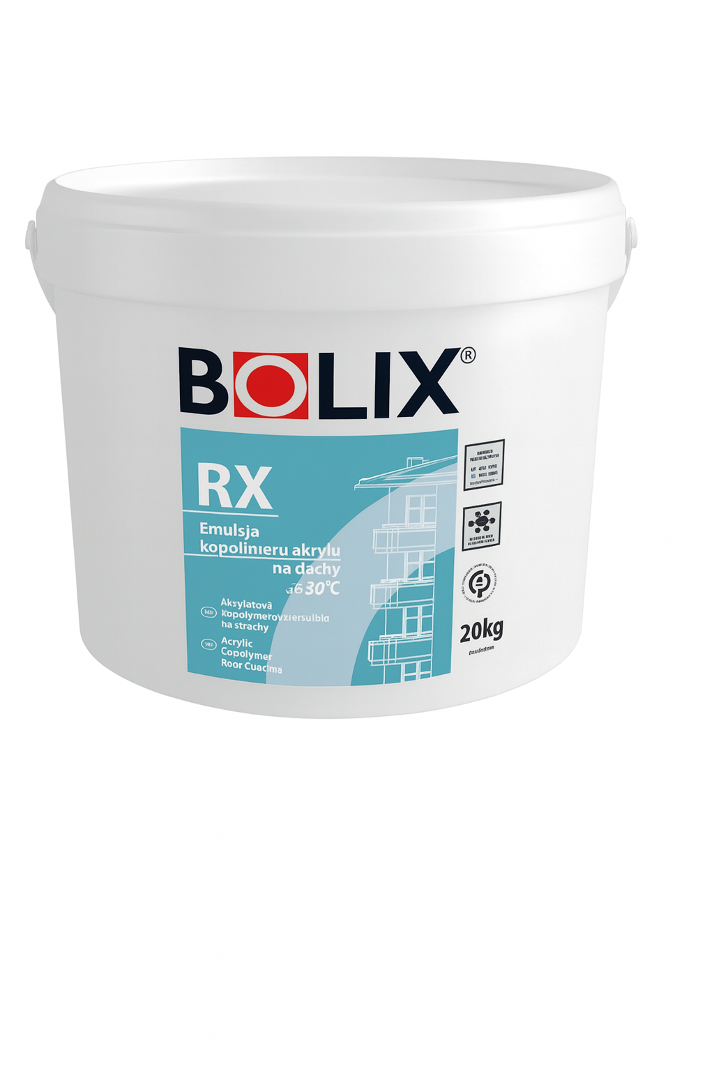 BOLIX RX to akrylowa powłoka malarska do dachów o nachyleniu min. 30°. Sprawdza się zarówno przy pierwszym malowaniu, jak i przy renowacji. Można nią malować m.in. papę, membrany PVC, gont, blachy (także ocynkowane czy nierdzewne), aluminium, miedź, dachówki cementowe oraz płyty włóknowo-cementowe.